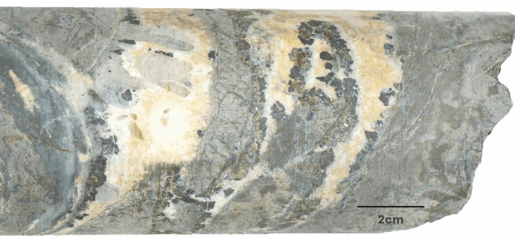 Gold mineralization is hosted within Triassic lapilli tuff, which is intruded by a Cretaceous quartz diorite and a feldspar porphyry dike of unknown age. The mineralization is associated with vein assemblages containing pyrite, sphalerite, and galena (Figure 2). While all three lithologies host gold, higher-grade intervals are preferentially located near the contacts between these units. Lower-grade mineralization occurs between the reported intervals. Analytical results for silver and other elements are pending from the laboratory.