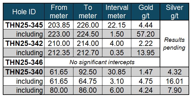 - Hole THN25-340 returned 30.85m of 1.47 g/t gold and 4.32 g/t silver from 61.65m depth