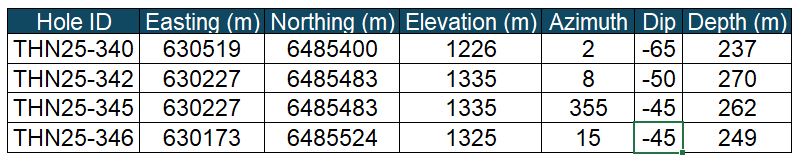 - Hole THN25-342 returned 4.00m of 2.22 g/t gold from 210.00m depth